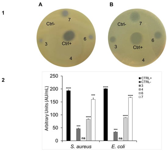 Bacterial growth inhibition: the inhibition halo of samples 3, 4, 6, and 7 (panel 1) against (A) S. aureus and (B) E. coli. The positive control is ampicillin; the negative control is dimethyl sulfoxide. Panel 2 reports arbitrary units in milliliters for both bacterial strains. The assays were performed in three independent experiments (n = 3). Statistical analysis was performed using a two-tailed paired t-test (ns is not significant, *** p ≤ 0.005, **** p ≤ 0.001) versus the negative control.
