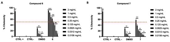 Cytotoxicity of 6 (A) and 7 (B) on the VERO-76 cell line after 24 h. The data represent the mean ± SD. Dunnett’s multiple comparisons test: **** p < 0.0001; *** p < 0.001; ** p < 0.01; ns p > 0.05.