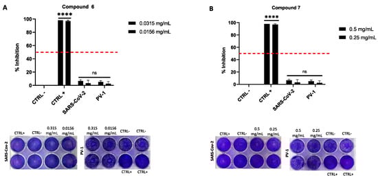 Antiviral activity of 6 (A) and 7 (B) against SARS-CoV-2 and PV-1. The data represent the mean ± SD. Dunnett’s multiple comparisons test: **** p < 0.0001; ns p > 0.05.