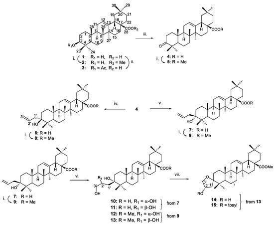 Methyl ester 2 was obtained by the treatment of compound 1 with an ethereal solution of CH2N2 at 0 °C. Acetate 3 was obtained from 1 with a standard acetylation procedure by treatment with Ac2O/Py, as reported previously []. The 3-oxoderivatives 4 and 5 were obtained by the oxidation of 1 [] followed by CH2N2 methylation under the same conditions described above. The two epimeric 3-allyl derivatives 6 and 7 were prepared by Barbier–Grignard allylation with allyl magnesium bromide as previously reported []. Then, the new methyl esters 8 and 9 were obtained by the methylation of compounds 6 and 7, respectively. The epimer 7 was obtained as a largely minor product in the Grignard reaction. Alternatively, 7 can be obtained, as we demonstrated within this work for the first time, by the Barbier–Grignard allylation of compound 4 performed with allyl bromide and indium in THF. This procedure is compatible with the presence of the ester function at C-28, which, on the other side, is incompatible with the strong basicity of the organo-magnesium reagents. Compounds 10 and 11 were prepared by osmylation, as described previously [], while new compounds 12 and 13 were obtained by the same procedure applied on the methyl ester 9 (Scheme 1).