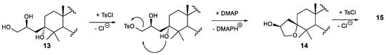 In the procedure to synthesized 15 as a major component: 100 mg (0.184 mmol) of compound 13 was dissolved in 10 mL of dry dichloromethane. Then, 53 mg (1.5 eq.) of tosyl chloride, 25.5 µL (1 eq.) of triethylamine were added in one portion at rt. Then, the mixture was stirred for 72 h and then further 8.5 eq. of tosyl chloride, 9 eq. of triethylamine, and 2 eq. of DMAP were added. The reaction mixture was stirred for further 6 h and then quenched with 10 mL of water. The organic phase was dried, and the solvent was evaporated. The residue was purified by chromatographic column (cyclohexane/EtOAc 10:1) to give pure 14 (23%) and pure 15 (75%).
