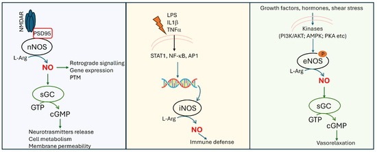 - Maccallini, C.; Amoroso, R. Neuronal Nitric Oxide Synthase and Post-Translational Modifications in the Development of Central Nervous System Diseases: Implications and Regulation. Molecules 2023, 28, 6691. [Google Scholar] [CrossRef] [PubMed]
