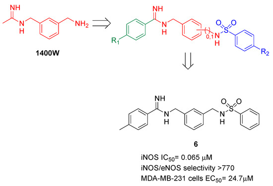 - Carrión, M.D.; Rubio-Ruiz, B.; Franco-Montalban, F.; Amoia, P.; Zuccarini, M.C.; De Simone, C.; Camacho, M.E.; Amoroso, R.; Maccallini, C. New amidine-benzenesulfonamides as iNOS inhibitors for the therapy of the triple negative breast cancer. Eur. J. Med. Chem. 2023, 248, 115112. [Google Scholar] [CrossRef] [PubMed]