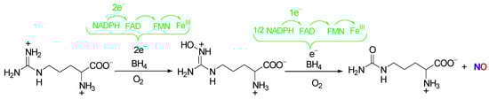 - Santolini, J. The molecular mechanism of mammalian NO-synthases: A story of electrons and protons. J. Inorg. Biochem. 2011, 105, 127–141. [Google Scholar] [CrossRef] [PubMed]
