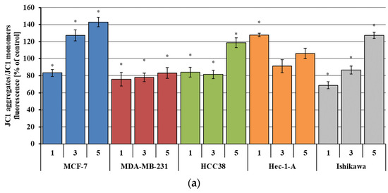 The endometrial cancer cells (Ishikawa and Hec-1-A) demonstrated similar changes in ΔΨm to the breast cancer cells. It should be emphasized, however, that in Hec-1-A, statistically significant changes in mitochondrial potential, i.e., approximately 30% hyperpolarization compared to control, were observed only for compound 1: no changes in ΔΨm were observed for derivatives 3 and 5. The Ishikawa cultures also demonstrated dysfunctional mitochondria, indicating the initiation of apoptosis. A particularly high decrease in ΔΨm was observed for compound 1 (about 30%) and a slightly smaller decrease for compound 3 (about 15%). Interestingly, as in the case of the MCF-7 and HCC38 breast cancer cell lines, exposure of the Ishikawa line to derivative 5 resulted in strong hyperpolarization of mitochondrial membranes (approximately 30% relative to controls).