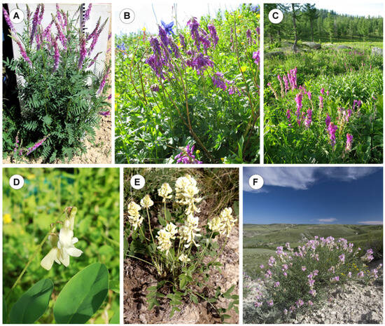 Plants growing on the trial plot (AIMAP, Moscow) and wild populations of some Hedysarum species. H. alpinum (the trial plot of AIMAP, Moscow, Russia) (A), H. neglectum (the Altai region, Russia) (B), H. theinum (Kazakhstan) (C), H. flavescens (the trial plot of AIMAP, Moscow, Russia) (D), H. grandiflorum (Volgograd region, Russia) (E), and H. razoumovianum (Volgograd region, Russia) (F). The figure is adapted from “Molecular Cytogenetics of Eurasian Species of the Genus Hedysarum L. (Fabaceae)” by Yurkevich et al., 2021, Plants, 10, 89 [29] and “Integration of Genomic and Cytogenetic Data on Tandem DNAs for Analyzing the Genome Diversity Within the Genus Hedysarum L. (Fabaceae)” by Yurkevich et al., 2022, Frontiers in Plant Science, 13, 865958 [39].