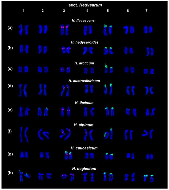 Karyotypes of the studied accessions of species from the sect. Hedysarum. Karyograms of H. flavescens (a), H. hedysaroides (b), H. arcticum (c), H. austrosibiricum (d), H. theinum (e), H. alpinum (f), H. caucasicum (g), and H. neglectum (h) after FISH with 45S rDNA (green) and 5S rDNA (red). Chromosome DAPI-staining—blue. The figure is adapted from “Molecular Cytogenetics of Eurasian Species of the Genus Hedysarum L. (Fabaceae)” by Yurkevich et al., 2021, Plants, 10, 89 [29].