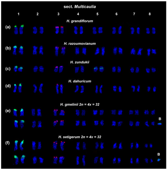 Karyotypes of the studied species accessions from the sect. Multicaulia. Karyograms of the studied accessions of diploid H. grandiflorum (a), H. razoumovianum (b), H. zundukii (c), H. dahuricum (d), and also tetraploid H. gmelinii (e), and H. setigerum (f) after FISH with 45S (green) and 5S (red) rDNA. B—B chromosomes. DAPI chromosome staining—blue. The figure is adapted from “Integration of Genomic and Cytogenetic Data on Tandem DNAs for Analyzing the Genome Diversity Within the Genus Hedysarum L. (Fabaceae)” by Yurkevich et al., 2022, Frontiers in Plant Science, 13, 865958 [39].