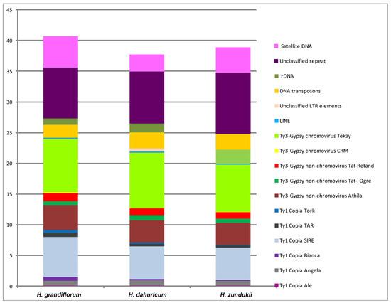 Comparative studies of repeatomes of related species provide new insight into the organization and divergence of their genomes, and, currently, intra- and interspecific variability in repeated DNA content is being extensively studied [81,82,83]. Recently, the comparative analysis of repeatomes of H. grandiflorum, H. zundukii, and H. dahuricum (sect. Multicaulia) was performed, which included DNA sequencing of their genomes based on NGS technology and the genome-wide bioinformatic analysis by RepeatExplorer/TAREAN pipelines [39]. In H. grandiflorum, H. zundukii, and H. dahuricum, a high similarity in the composition of their repeatomes was revealed. According to the results of RepeatExplorer/TAREAN analysis, transposable elements (TEs) made up the majority of their repetitive DNAs (Figure 4). Depending on the species, 20–24% of the revealed TEs belonged to retrotransposons (Class I), and about 2.0–2.5% of the TEs belonged to transposons (Class II).