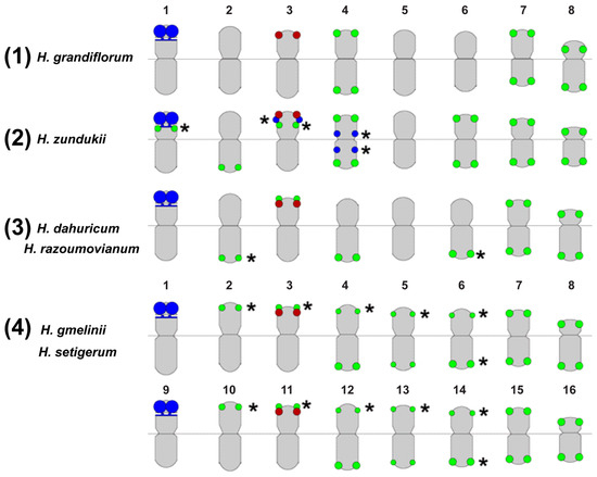 The analysis of patterns of chromosome distribution of the examined molecular markers (45S rDNA, 5S rDNA, and the satDNAs) showed that the studied species could be subdivided into four karyological groups: (1) H. grandiflorum (subsection Subacaulia), (2) H. zundukii (subsection Subacaulia), (3) H. razoumovianum, H. dahuricum (subsection Multicaulia), H. gmelinii, and H. setigerum (subsection Multicaulia) (4) (Figure 5) [39]. The similarity of chromosome distribution patterns of the satDNAs observed in H. setigerum and H. gmelinii, confirmed the earlier reported taxonomic status of H. setigerum as a subspecies of H. gmelinii [16,19]. Thus, the comprehensive molecular cytogenetic analysis of six species from the sect. Multicaulia revealed a close relationship among their genomes (regardless of the regions of their growth and the range sizes), indicating that they have a common origin.