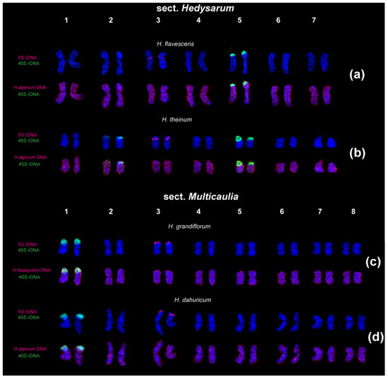 Karyograms of the H. flavescens (a), H. theinum (b), H. grandiflorum (c), and H. dahuricum (d) after FISH with 45S rDNA (green) and 5S rDNA (red), and also rapidGISH with genomic DNA of H. flavescens and/or H. alpinum (red). Chromosome DAPI-staining—blue. The figure is adapted from “Comparative analysis of genomes of six species of Hedysarum L. (Fabaceae) by the rapidGISH technique” by Yurkevich et al., 2023, Problems of Botany in Southern Siberia and Mongolia 22, 436–440 [92].