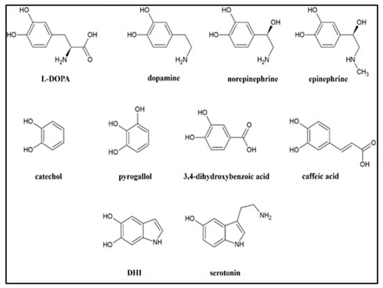 Dopamine.HCl (Thermo Scientific, Waltham, MA, USA), L-DOPA (MP Biomedicals, Santa Ana, CA, USA), epinephrine (Alfa Aesar, Ward Hill, MA, USA), norepinephrine.HCl (Sigma, Tokyo, Japan), catechol (Acros Organics, Geel, Belgium), pyrogallol (Sigma), caffeic acid (Sigma), 3,4-dihydroxybenzoic acid (Aldrich, St. Louis, MO, USA), serotonin.HCl (Thermo Scientific), 5,6 dihydroxyindole (DHI; Thermo Scientific), and LaCl3·7H2O (Thermo Scientific) were all purchased through Fisher Scientific (Waltham, MA, USA) but originated from different suppliers as indicated.