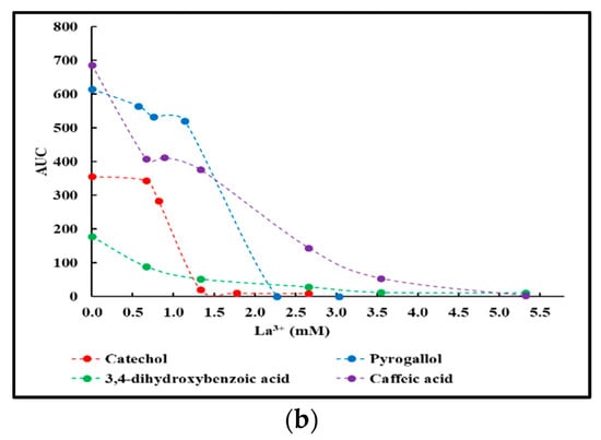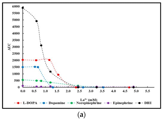 Except for the reaction involving serotonin, a small-scale precipitation test involving La3+ was performed on the dialyzed crude reaction mixtures as outlined in Section 4.3. AUC values calculated according to Equation (1) of the resulting supernatants were plotted as a function of the La3+ concentration present. Figure 2 presents the results thus obtained. For clarity purposes, the results were grouped into two panels: L-DOPA, dopamine, norepinephrine, epinephrine, and DHI in panel (a), and catechol, pyrogallol, 3,4-dihydroxybenzoic acid, and caffeic acid in panel (b).