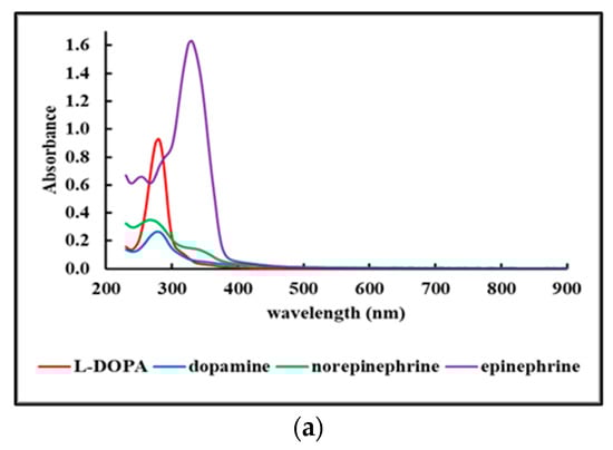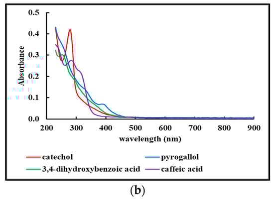Figure 3 shows the UV-Vis spectra of the various Fdisp fractions dispersed in water at 100 μg/mL. For clarity purposes, the results were grouped into two panels: L-DOPA, dopamine, norepinephrine, and epinephrine in panel (a), and catechol, pyrogallol, 3,4-dihydroxybenzoic acid, and caffeic acid in panel (b).