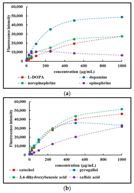 Figure 4 shows the concentration-dependent fluorescence recorded for the various Fdisp fractions. For clarity purposes, the results were grouped into two panels: L-DOPA, dopamine, norepinephrine, and epinephrine in panel (a), and catechol, pyrogallol, 3,4-dihydroxybenzoic acid, and caffeic acid in panel (b).