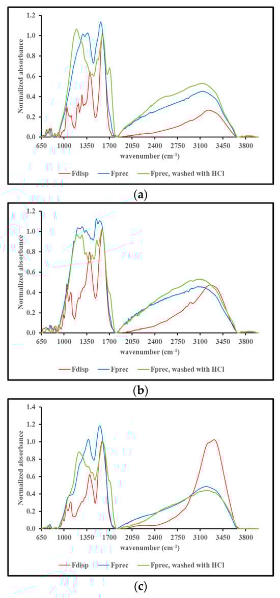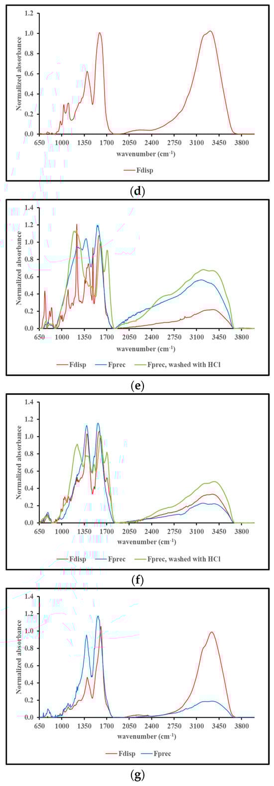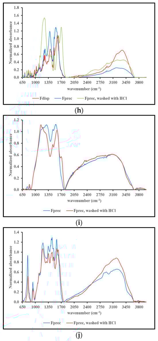 Figure 5, panels a through j, show the FT-IR spectra of Fdisp, Fprec before and Fprec after washing with 1 N HCl. Each panel is focused on the materials obtained from a single precursor, and all spectra are normalized for their absorbance at 1600 cm−1 for comparison purposes.