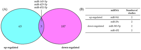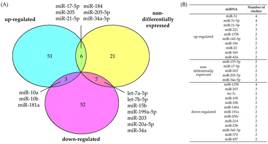 Consensus of upregulated and downregulated miRNAs in BCC. (A) Conflicting evidence leaves the deregulation status of several miRNAs unclear. The intersections of the Venn diagram represent miRNAs whose differential expression trend has been conflictingly reported in two or more studies. (B) The table presents up- and downregulated miRNAs based on the consensus of two or more studies regarding their dysregulation status. Only comparisons of BCC to healthy skin were included in these analyses.