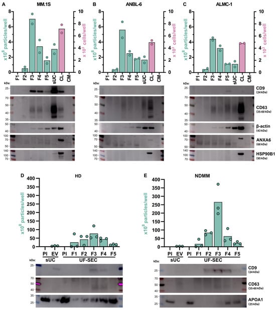 - Ferreira, B.V.; Carneiro, E.A.; Pestana, C.; Barahona, F.; Caetano, J.; Lopes, R.; Lúcio, P.; Neves, M.; Beck, H.C.; Carvalho, A.S.; et al. Patient-Derived Extracellular Vesicles Proteins as New Biomarkers in Multiple Myeloma—A Real-World Study. Front. Oncol. 2022, 12, 860849. [Google Scholar] [CrossRef] [PubMed]