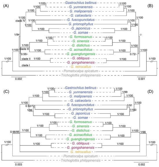 - Liu, D.K.; Tu, X.D.; Zhao, Z.; Zeng, M.Y.; Zhang, S.; Ma, L.; Zhang, G.Q.; Wang, M.M.; Liu, Z.J.; Lan, S.R.; et al. Plastid phylogenomic data yield new and robust insights into the phylogeny of Cleisostoma-Gastrochilus clades (Orchidaceae, Aeridinae). Mol. Phylogenet. Evol. 2020, 145, 106729. [Google Scholar] [CrossRef] [PubMed]