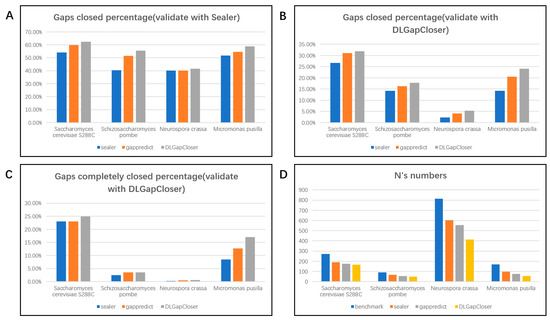 Gap-filling improvements and effects on the draft assemblies. (A) shows the percentage of filled gaps for three tools across four datasets, evaluated using the Sealer evaluation standard; (B) shows the percentage of filled gaps for three tools across four datasets, evaluated using the DLGapCloser evaluation standard; (C) shows the percentage of completely filled gaps for three tools across four datasets, evaluated using the DLGapCloser evaluation standard; (D) shows the remaining number of N/n on the filled scaffolds after gap filling by the three tools.