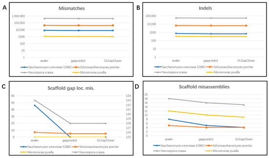 Finally, Figure 3 summarizes the QUAST evaluation results across the four datasets. From the overall comparison shown in the figure, it is evident that DLGapCloser performs similarly to the other two tools in terms of mismatches and indels. For the Scaffold gap loc. mis. metric, GapPredict and DLGapCloser perform similarly to and better than Sealer. However, for the Scaffold misassemblies metric, DLGapCloser outperforms GapPredict in most datasets.