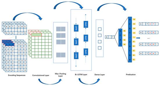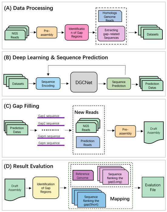 The working principle of DLGapCloser is as follows (see schematic in Figure 4), mainly divided into the following four stages. First, the data-processing stage: Using Sealer assembly software, short-read gene fragments are assembled to generate intermediate scaffold files. Gaps produced during the assembly process are identified based on the scaffold files. SAMTools (accessed on 11 April 2023) [13] and BEDtools (accessed on 11 April 2023) [14] are used to find the positional coordinates of flanking gene segments in the original genome based on gap segment information, which are then trimmed. Read data mapped to the segments in both the original genome and homologous genomes are identified, and matched read information is filtered and trimmed to form the input data required for the next step of deep learning. Second, the deep learning and sequence prediction stage: Gene sequences are converted into vector forms, and DGCNet is used to learn the spatial and sequence features of sequences. AGCT is predicted using softmax to determine the maximum possibility, and Wave-Beam search is used to obtain gap prediction data. Then, the gap-filling stage: Deep learning-predicted result data and initial short-read genome data are input into Sealer for assembly, generating new assembly results and intermediate scaffold files. Finally, the filling result evaluation stage: BWA-MEM (accessed on 12 April 2023) [15] is used to compare the gap flank sequence data generated in the data-preprocessing stage with the reference genome. The reference gene sequence of the gap is determined using coordinate information from both sides, and gap information is re-obtained from the scaffold file using the same method. Exonerate (accessed on 18 October 2023) [16] is used to compare the two sequences, and the sequence consistency percentage is used to determine the difference between the predicted assembly sequence and the reference gene sequence. At the same time, QUAST software is used to evaluate the accuracy and completeness of the filling results of the three filling tools.