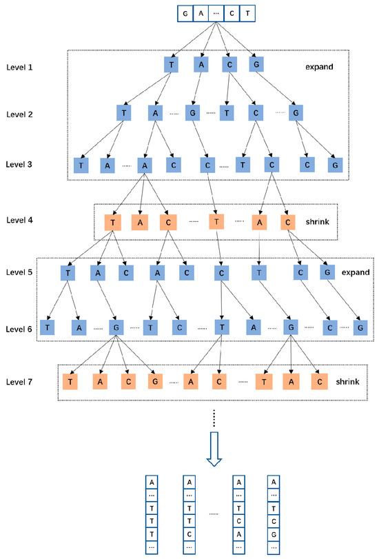 Overview of the Wave-Beam search algorithm. The algorithm is divided into the Expand phase (Levels 1–3 and Levels 5–6) and the Shrink phase (Level 4 and Level 7). The two phases alternate, and the algorithm ends the prediction when the predicted length is reached.