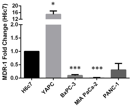 MDR-1 mRNA levels in pancreatic cancer cells. MDR-1 mRNA levels were evaluated in pancreatic cancer cells by qRT-PCR. The fold change was reported compared to H6c7 cells. The relative quantification was considered upregulated when there was a minimum of a two-fold change. Data represent the mean ± SEM of at least three independent experiments. *p < 0.05; *** p < 0.001.