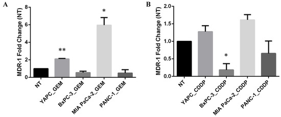 MDR-1 mRNA levels in pancreatic cancer cells. MDR-1 mRNA levels were evaluated in pancreatic cancer cells after 72 h of gemcitabine (GEM) (A) or cisplatin (CDDP) (B) exposure. The EC50 values, calculated for each drug and each cell line, were used for the treatment. The fold change was reported compared to non-treated (NT) cells. The relative quantification was considered upregulated when there was a minimum of a two-fold change. Data represent the mean ± SEM of at least three independent experiments. * p < 0.05; ** p < 0.01.