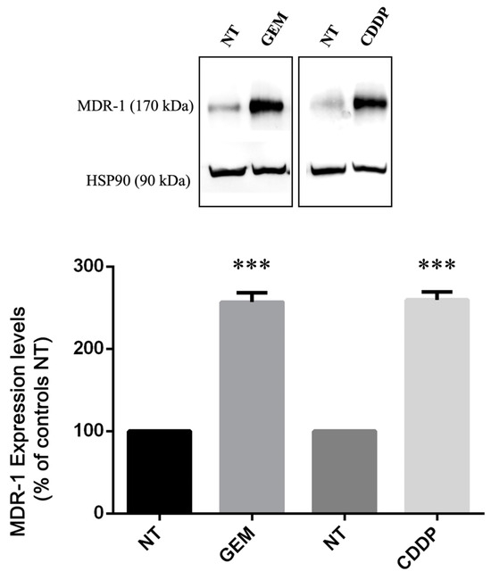 In contrast, the most gemcitabine-sensitive MIA PaCa-2 cells displayed a high increase in MDR-1 mRNA levels after treatment probably as a failed attempt of the cells to respond to the drug. Indeed, it was reported in other types of cancers, such as, for instance, melanoma, non-small-cell lung cancer, small-cell lung cancer, epidermoid carcinoma, and ovarian cancer, that after gemcitabine treatment, cells are characterized by an increase in MDR-1 expression together with the acquisition of more sensitivity to gemcitabine compared to parental cell lines. This was demonstrated to be because P-glycoprotein overexpression may cause cellular stress, resulting in increased gemcitabine metabolism and sensitivity [42]. Nevertheless, we could not detect the protein in MIA PaCa-2 cells, both untreated or treated with GEM or CDDP, presumably due to the absence or very low levels of the MDR-1 protein undetectable by Western Blot analysis.