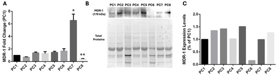 For this reason, we then analyzed MDR-1 mRNA levels in tissues from pancreatic cancer patients. Despite the low number of patients analyzed, we found higher MDR-1 mRNA levels in the PC7 sample, which is characterized by homozygous polymorphisms in exons 21 (2677T>G) and 12 (1236T>C). In contrast, levels of MDR-1 mRNA were unchanged in PC5, characterized by the same homozygous polymorphisms (Figure 4A). Then, we decided to validate qPCR data by Western Blot analysis on protein extracts purified from patient tissues to evaluate MDR-1 protein levels (Figure 4B,C). The data reveal a poor correlation between mRNA and protein abundance for MDR-1. Indeed, surprisingly, high levels of MDR-1 mRNA expression in PC7 do not correlate with a high abundance of the MDR-1 protein. Patients with the same homozygous polymorphisms (PC5 and PC7 patients) showed similar MDR-1 protein levels to patients without polymorphisms (PC1) or heterozygous polymorphisms (PC2-4, PC6, PC8). PC5 and PC7 do not show an increase in MDR-1 protein levels, confirming that in our patient’s cohort, the homozygous polymorphisms in MDR-1 are not related to an increase in the protein levels.