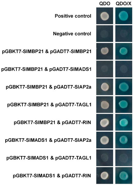 Yeast two-hybrid assay of SlMBP21 and SlMADS1 with other sepal development-related proteins. SlMBP21 could interact with SlMBP21, SlAP2a, TAGL1 and RIN but not with SlMADS1; SlMADS1 could interact with SlAP2a and RIN, but not with TAGL1, individually. QDO, SD medium lacking Trp, Leu, His, and adenine. QDO/X, SD medium lacking Trp, Leu, His, and adenine with X-α-Gal.