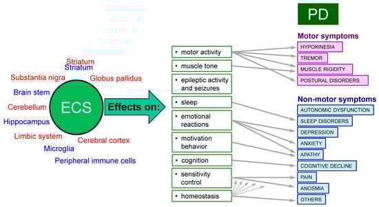 ECS and clinical manifestations of PD. The predominant localization of CBR1s (red) and CBR2s (blue) are shown on the left. In the center and on the right, the relationships between the biological effects of ECS and the clinical symptoms of PD are shown. Possible “clinical targets” for ECS modulators are indicated by arrows.