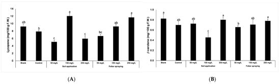 Lycopene [mg/100 g F.W.] (A) and β-carotene [mg/100 g F.W.] (B) content in tomato fruits of Maskotka cultivar. Vertical bars are used to display all data, which are the means of three replicates (±SD). Different letters (a, b, c, ab, bc, etc.) indicate the significant differences for a p-value ≤ 0.05.