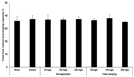 Total free radical scavenging capacity [%] in fruits harvested from Maskotka tomato plants. For statistical analysis, the parametric ANOVA test was conducted. The analyses indicated that there are no statistically significant differences between obtained results.