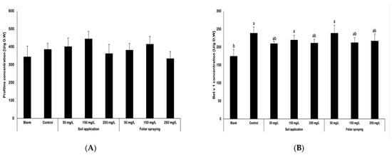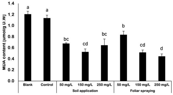 To determine malondialdehyde (MDA) content in leaves, the 2-thiobarbituric acid (TBA) in accordance with the method of Li et al. (2013) [] was applied. The first step of the procedure was to ground 1 g of plant tissues with 5 mL 10% trichloroacetic acid (TCA). Subsequently, the mixture was centrifuged at 4000× g for 20 min and 2 mL of supernatant was mixed with 2 mL of 0.6% thiobarbituric acid in 10%TCA. Next, the sample was heated at 100 °C for 15 min and then cooled in ice. Lastly, samples were centrifuged at 4000× g for 10 min. The absorbance was measured at 450, 532, and 600 nm. Data were calculated as μmol per gram of dry weight (μmol/g D.W.). The MDA content was determined on a dry weight basis as follows: