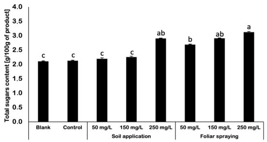Total sugars content [g/100 g of product] in tomato fruits of Maskotka cultivar. Vertical bars are used to display all data, which are the means of three replicates (±SD). Different letters (a, b, c, ab, bc, etc.) indicate the significant differences for a p-value ≤ 0.05.