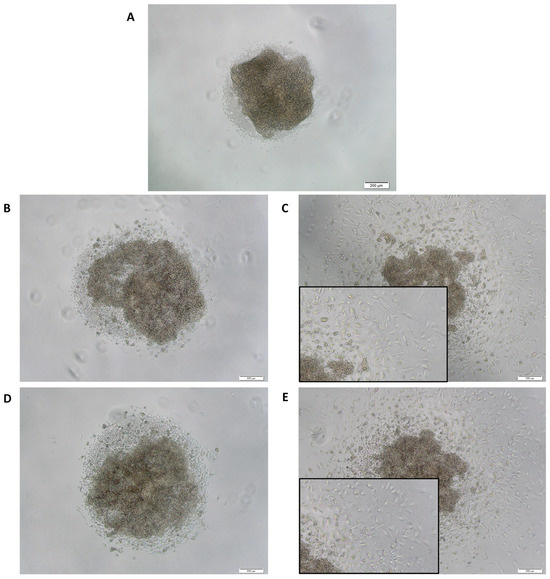 After therapy, PDCSs were checked microscopically for morphological changes. Conspicuously, in a few samples, both CurB- and SC CurB-treated spheroids showed alterations in cellular morphology in the periphery, appearing spike-like (Figure 2C,E). After treatment with a cell culture medium, either CurA or SC CurA, these specific morphological changes were not observed (Figure 2A,B,D).