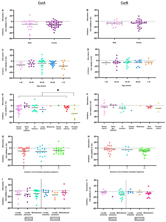 CurA revealed stronger anti-cancer effects in samples of patients < 40 years (mean −13.81%, n = 6, p = 0.226) and > 70 years (mean −17.74%, n = 8, p = 0.208) (Figure 3C). In contrast to CurA, the effects of CurB were stronger in heavily pre-treated patients (mean −9.61%, n = 20) compared to non-pre-treated patients (mean −3.06%, n = 19, p = 0.060) (Figure 3H). Additionally, CurB showed stronger anti-cancer activity in metastatic cancers (mean −8.62%, n = 27) compared to non-metastatic tumors (mean −2.60%, n = 17, p = 0.062, Table 2) (Figure 3J). There were no differences between samples derived from male or female patients (Figure 3A,B). Regarding CurA, there were no subgroup-differences dependent on the number of pre-treated standard regimens or the tumor status (Figure 3G,I). In contrast, CurB did not show a better or worse response depending on the patients’ age (Figure 3D).