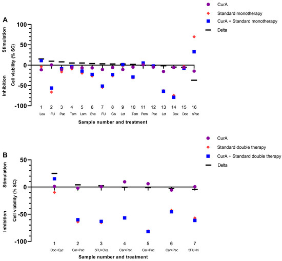 Combination of Curcumin A with standard mono- (A) and double therapies (B) in the patient-derived cancer spheroid (PDCS) model. Delta shows the difference between the standard treatment and its combination with CurA. (A) CurA, Curcumin A; Leu, Leuprorelin; FU, 5-Fluorouracil; Pac, Paclitaxel; Tem, Temozolomide; Lom, Lomustine; Eve, Everolimus; Cis, Cisplatin; Let, Letrozol; Pem, Pembrolizumab; Dox, Doxorubicin; Doc, Docetaxel; nPac, Nab-Paclitaxel. (B) Doc+Cyc, Docetaxel+Cyclophosphamid; Car+Pac, Carboplatin+Paclitaxel; 5FU+Oxa, 5-Fluorouracil+Oxaliplatin; 5FU+Iri, 5-Fluorouracil+Irinotecan.