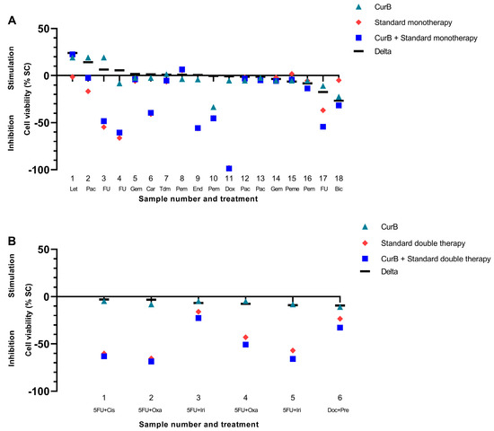 Combination of Curcumin B with standard mono- (A) and double therapies (B) in the patient-derived cancer spheroid (PDCS) model. Delta shows the difference between standard treatment and its combination with CurB. (A) CurB, Curcumin B; Let, Letrozol; Pac, Paclitaxel; FU, 5-Fluorouracil; Gem, Gemcitabine; Car, Carboplatin; Tdm, TDM-1; Pem, Pembrolizumab; End, Endoxifen; Dox, Doxorubicin; Pac, Paclitaxel; Peme, Pemetrexed, Bic, Bicalutamide. (B) 5FU+Cis, 5-Fluorouracil+Cisplatin; 5FU+Oxa, 5-Fluorouracil+Oxaliplatin; 5FU+Iri, 5-Fluorouracil+Irinotecan; Doc+Pre, Docetaxel+Prednisolon.