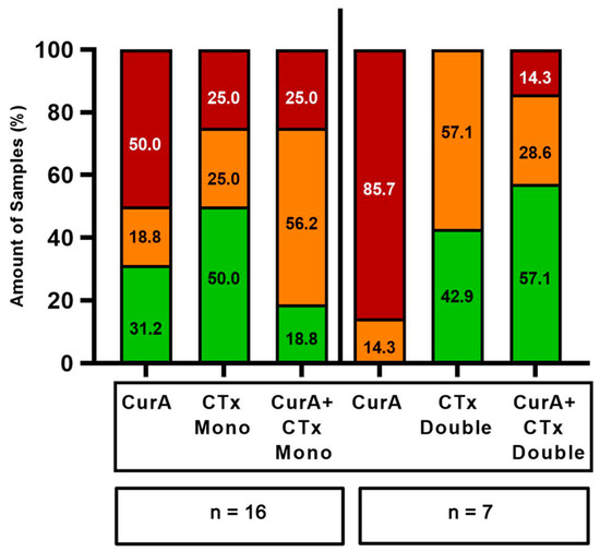 Cur formulations were combined with standard mono- and double therapies of various drug classes (Figure 4 and Figure 5). The combination of Cur and standard monotherapies was considered the best treatment option in 10/34 samples (29.41%) (green bars in Figure 6 and Figure 7). The best treatment option was defined as being superior to either agent on its own. However, in 6/34 samples (17.65%), the combination of Cur and standard monotherapies was considered the worst treatment option, being inferior to both agents on their own (red bars, Figure 6 and Figure 7). Regarding standard double therapies, the combination with Cur formulations resulted in the best treatment option in 10/13 (76.92%) samples and the worst in only 1/13 (7.69%) (Figure 6 and Figure 7).