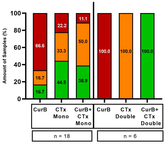 Frequency of the best and worst treatment options of Curcumin B, standard mono- and double therapies alone and their combination. Red bars, worst treatment option; orange bars, neither worst nor best treatment option; green bars, best treatment option. CurB, Curcumin B; CTx Mono, standard monotherapies; CTx Double, standard double therapies; n, number of samples tested.