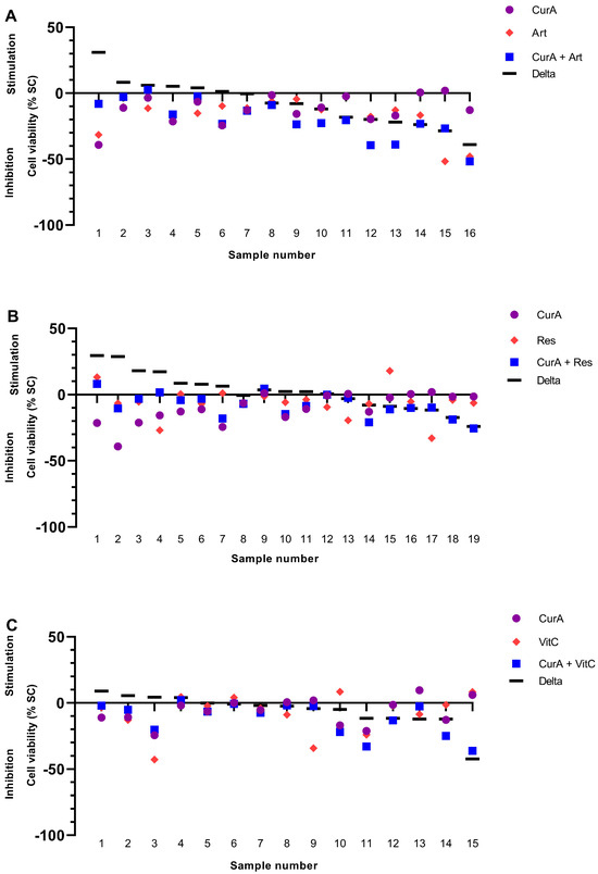 Combination of Curcumin A with Artesunate (A), Resveratrol (B) and Vitamin C (C) in the patient-derived cancer spheroid (PDCS) model. Delta shows the difference between CurA alone and in combination with a second complementary substance. CurA, Curcumin A; Art, Artesunate; Res, Resveratrol; VitC, vitamin C.
