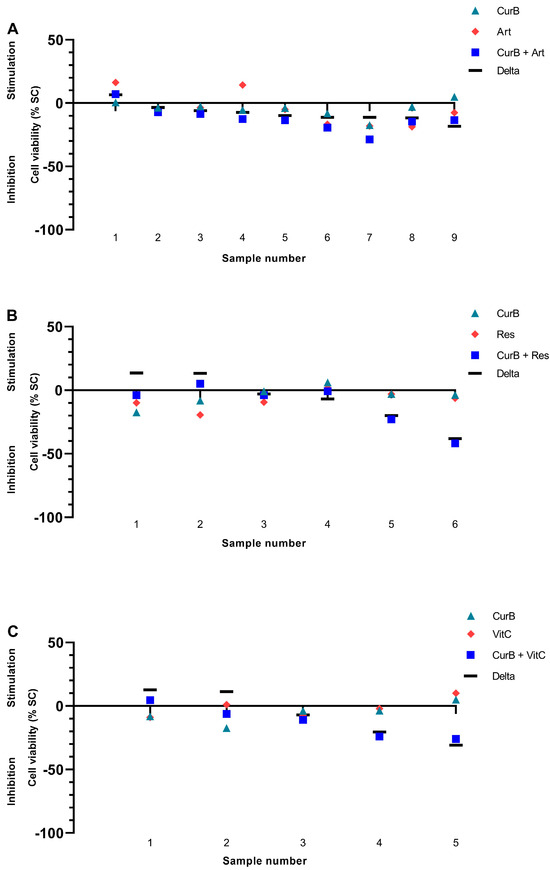 Combination of Curcumin B with Artesunate (A), Resveratrol (B) and Vitamin C (C) in the patient-derived cancer spheroid (PDCS) model. Delta shows the difference between CurB alone and in combination with a second complementary substance. CurB, Curcumin B; Art, Artesunate; Res, Resveratrol; VitC, Vitamin C.
