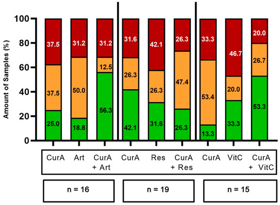 Cur formulations were combined with either Artesunate (Art), Resveratrol (Res) or vitamin C (VitC) in 70 PDCS samples (Figure 8 and Figure 9). Their combination resulted in being superior to either agent alone in 35/70 (50.00%) samples (green bars, Figure 10 and Figure 11). However, they were considered the worst treatment option in 16/70 (22.86%) samples (red bars, Figure 10 and Figure 11).