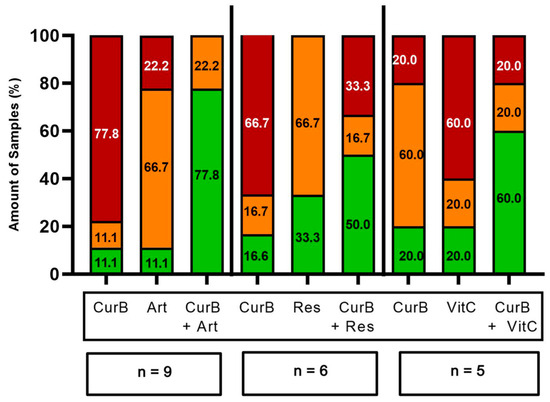 Frequency of the best and worst treatment options of Curcumin B and Art, Res and VitC alone and their combination. Red bars, worst treatment option; Orange bars, neither worst nor best treatment option; Green bars, best treatment option. CurB, Curcumin B; Art, Artesunate; Res, Resveratrol; VitC, Vitamin C; n, number of samples tested.