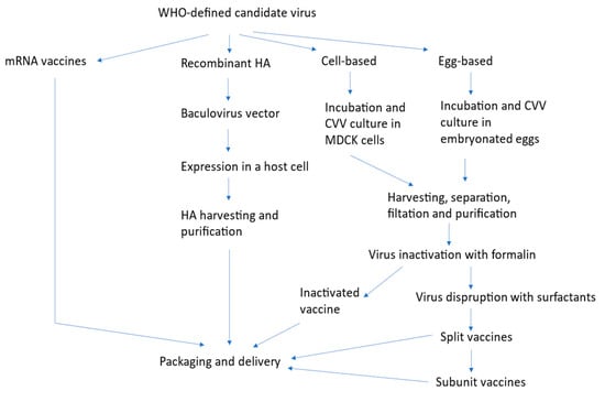 Several influenza vaccine manufacturing processes are possible nowadays (Figure 1) [,]. Under the currently most commonly used production technology, hundreds of millions of 11-day-old fertilized hens’ eggs are needed to produce the required amount of protein antigens, and the world is currently suffering an egg shortage []. While such system cannot meet surge capacity requirements, it is even more challenged by the scenario of bird flu, which could ravage hens. Although flocks of hens used for egg production are housed in biosecurity facilities and are segregated from the food supply, they nevertheless require periodic replacement. Recently, Madin−Darby canine kidney (MDCK) cells have been used to replace eggs and avoid egg adaptation of the virus.