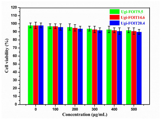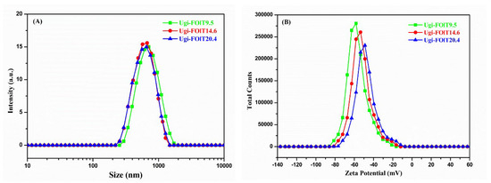 | Ugi-FOlT9.5 | 710 ± 40 | 0.38 ± 0.03 | −58.2 ± 1.9 |