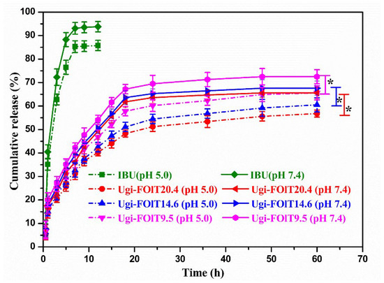 2.4. In Vitro Release Behavior of IBU for Ugi-FOlT Micelles
